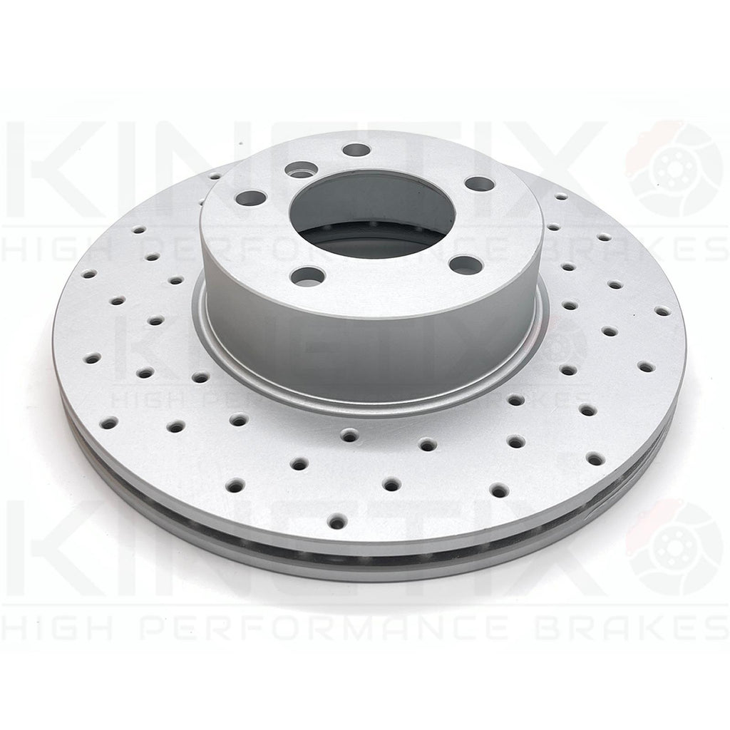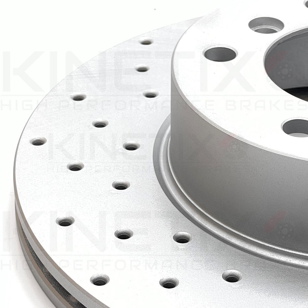 Brake gas build up is a major problem when braking at high speeds which effectively causes brake fade. The drilled disc surface on the kinetix brake discs dissipate heat more effectively by breaking down surface gases more efficiently. The holes are laser drilled through the discs which reduce brake mass. The drilled brake discs also benefit from keeping braking temperatures rapidly low which helps keep the pad surface from reaching high temperatures that can be caused from hot surface gasses.
