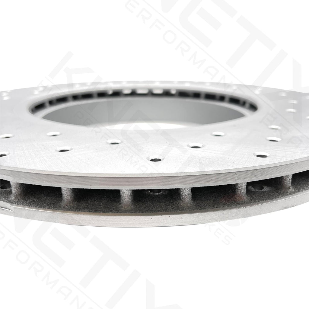 Brake gas build up is a major problem when braking at high speeds which effectively causes brake fade. The drilled disc surface on the kinetix brake discs dissipate heat more effectively by breaking down surface gases more efficiently. The holes are laser drilled through the discs which reduce brake mass. The drilled brake discs also benefit from keeping braking temperatures rapidly low which helps keep the pad surface from reaching high temperatures that can be caused from hot surface gasses.