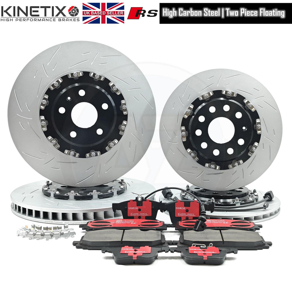 The Kinetix GT 2 Piece Floating Front Brake Rotor Upgrade Kit is a direct replacement for the factory front rotors on the 8Y Audi RS3, designed to work seamlessly with the OEM front calipers.