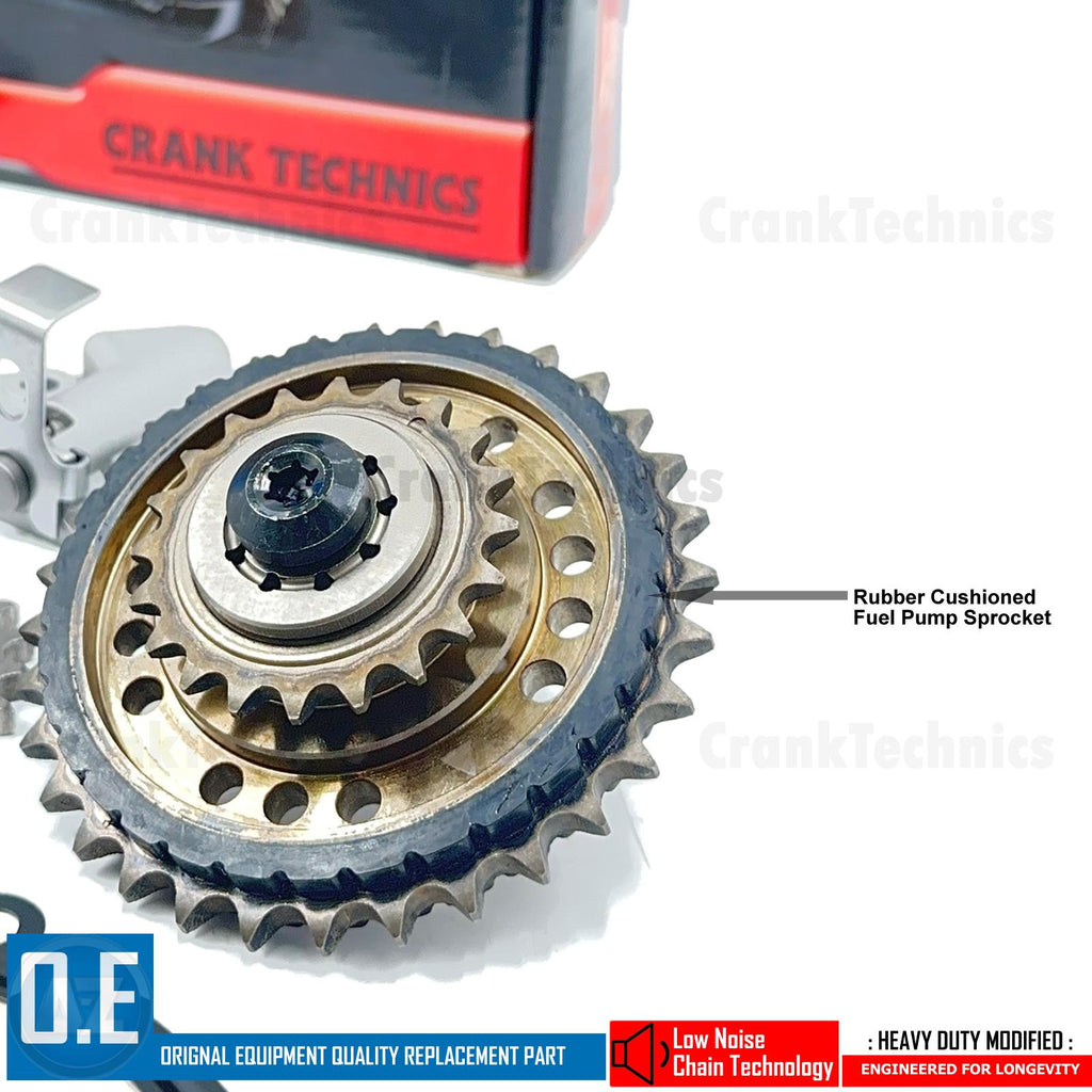 Additionally, the kit features a rubber cushioned fuel pump sprocket that enhances durability and reduces vibration.