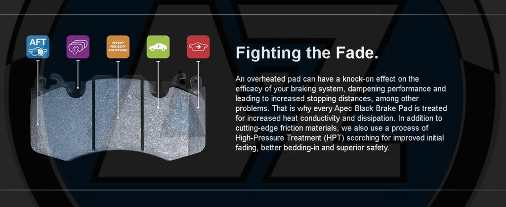 An overheated pad can have a knock-on effect on the efficacy of your braking system, dampening performance and leading to increased stopping distances, among other problems. That is why every Apec Black Brake Pad is treated for increased heat conductivity and dissipation. In addition to cutting-edge friction materials, we also use a process of High-Pressure Treatment (HPT) scorching for improved initial fading, better bedding-in and superior safety.