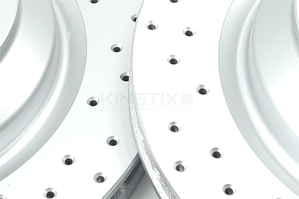 Brake gas build up is a major problem when braking at high speeds which effectively causes brake fade. The drilled disc surface on the kinetix brake discs dissipate heat more effectively by breaking down surface gases more efficiently. The holes are laser drilled through the discs which reduce brake mass. The drilled brake discs also benefit from keeping braking temperatures rapidly low which helps keep the pad surface from reaching high temperatures that can be caused from hot surface gasses.