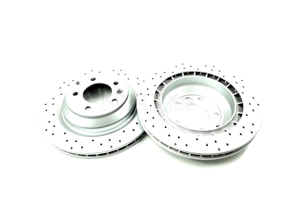 Brake gas build up is a major problem when braking at high speeds which effectively causes brake fade. The drilled disc surface on the kinetix brake discs dissipate heat more effectively by breaking down surface gases more efficiently. The holes are laser drilled through the discs which reduce brake mass. The drilled brake discs also benefit from keeping braking temperatures rapidly low which helps keep the pad surface from reaching high temperatures that can be caused from hot surface gasses.